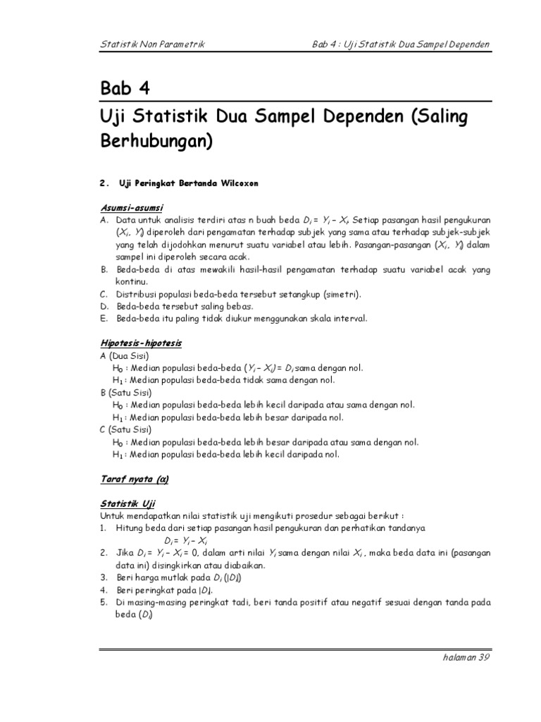 Asumsi asumsi untuk uji wilcoxon. Wilcoxon signed rank test adalah metode statistika non parametrik yang digunakan untuk membandingkan perbedaan dua median. Sebagai contoh uji wilcoxon signed rank test yaitu mengukur signifikansi perbedaan nilai ujian siswa sebelum dan sesudah pelajaran. 1 variabel bebas yaitu pelajaran dengan 2 kelompok sebelum pelajaran dan sesudah pelajaran 1 variabel terikat yaitu nilai ujian. Uji wilcoxon termasuk dalam pengujian nonparametrik. Fisher test merupakan uji eksak yang diturunkan oleh seorang bernama fisher karenanya disebut uji eksak fisher.