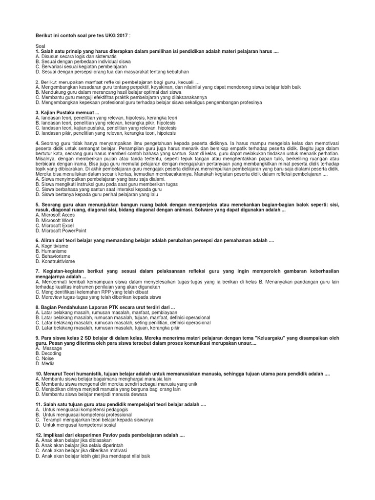 Contoh soal ukg 2017. Ukg adalah program yang dibentuk oleh pemerintah melalui departemen pendidikan untuk mengukur kompetensi pedagogik dan profesionalisme untuk melengkapi deretan tugas yang berhubungan dengan pendidikan yang diberikan kepadanya. Jika kita bandingkan dengan hitungan rata rata sekitar 70 dari soal ialah uji kompetensi profesional dan 30 dari itu kompetensi pedagogik. Ukg ulang diikuti oleh guru yang belum lulus ukg setelah sertifikasi guru melalui pola pendidikan dan latihan profesi guru plpg tahun 2016. Contoh soal latihan pre test ukg 2017. Sertifikasi guru dengan skema baru yang dimulai setahun yang lalu mempersyaratkan para peserta sertifikasi guru untuk lulus dalam dua ranah. Plpg dan ujian tulis nasional yang sering disingkat dengan utn.