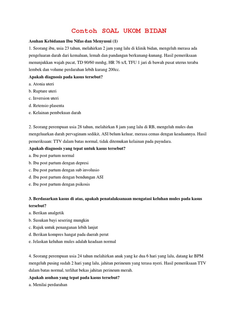 Contoh soal untuk uji kompetensi bidan 1 unknown. Pilihlah satu jawaban yang paling tepat. 1 sd 5 seseorang pasien perempuan yang bernama ny. Dibawah ini soal ukom bidan 2019 dan jawabannya pdf. Kumpulan ukom bidan indonesia baca juga. Kasus untuk soal no.