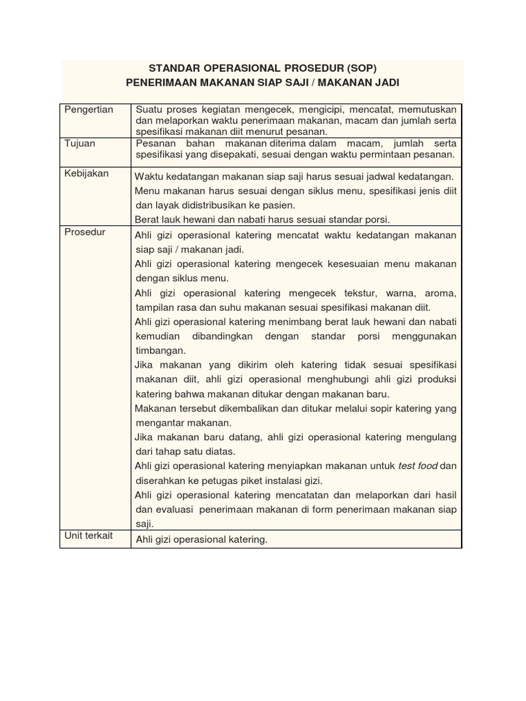 Standar operasional prosedur sop pengertian fungsi tujuan manfaat cara prinsip pelaksanaan pengembangan penerapan untuk pembahasan kali ini kami akan mengulas mengenai standar operasional prosedur sop yang dimana dalam hal ini meliputi pengertian fungsi tujuan manfaat cara prinsip pelaksanaan pengembangan dan penerapan nah agar lebih dapat memahami dan dimengerti. Form kebutuhan bahan baku ini meliputi jenis dan jumlah bahan baku yang rencananya dibutuhkan untuk proses produksi selama jangka waktu tertentu. Jika makanan yang dikirim oleh katering tidak sesuai spesifikasi makanan diit ahli gizi operasional menghubungi ahli gizi produksi katering bahwa makanan ditukar dengan makanan baru. Makanan tersebut dikembalikan dan ditukar melalui sopir katering yang mengantar makanan. Setiap kegiatan dan aktivitas yang dilakukan setiap hari tidak dapat dipisahkan dari nama sop dalam menyelesaikan suatu pekerjaan tertentu dengan tujuan agar memperoleh hasil kerja. Contoh sop produksi makanan.