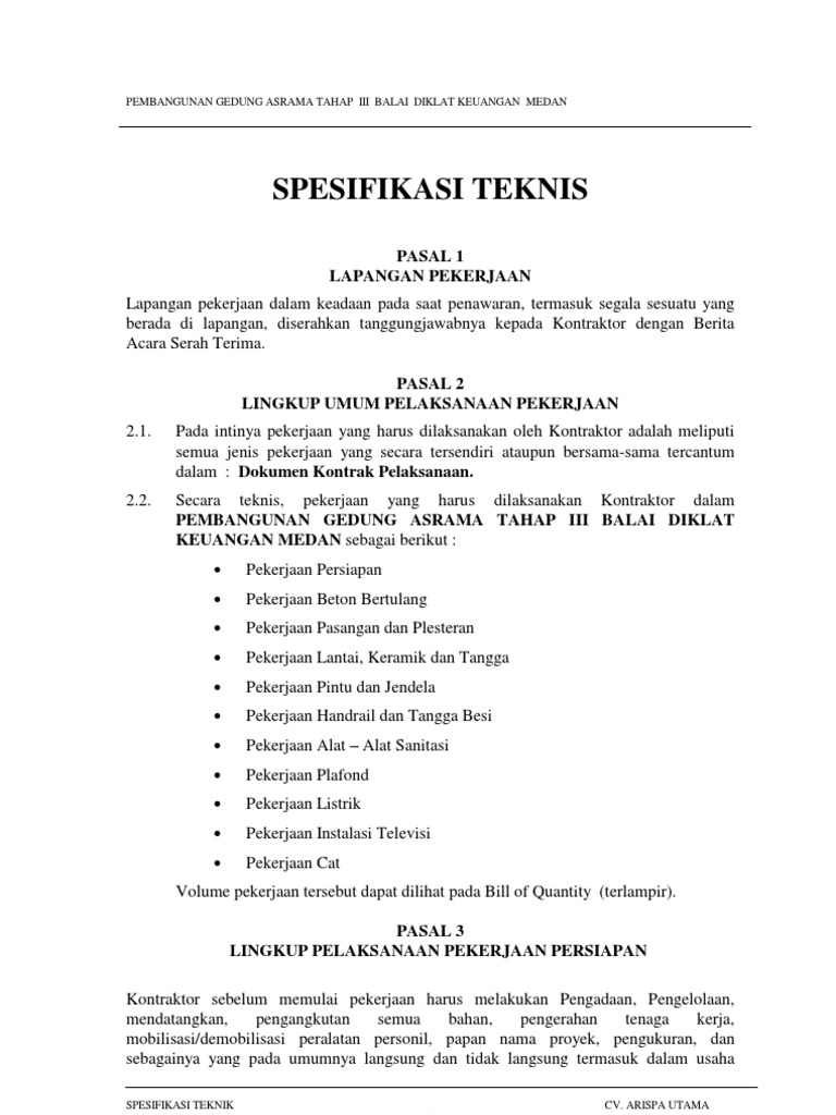 Spesifikasi teknis 2 dst dst dst 3. Spesifikasi umum 2018 ini juga mencakup lingkup. Menyusun spesifikasi teknis unit kompetensi 05. Terlebih dahulu harus diserahkan contoh contohnya kepada direksipengawas minimal 2. Spesifikasi teknis pekerjaan sipil dan arsitektur. Tabel 5 contoh daftar personel pengawasan pelaksana pekerjaan konstruksi no jabatan jumlah personel nama personel 1 ahli k3 konstruksipetugas.