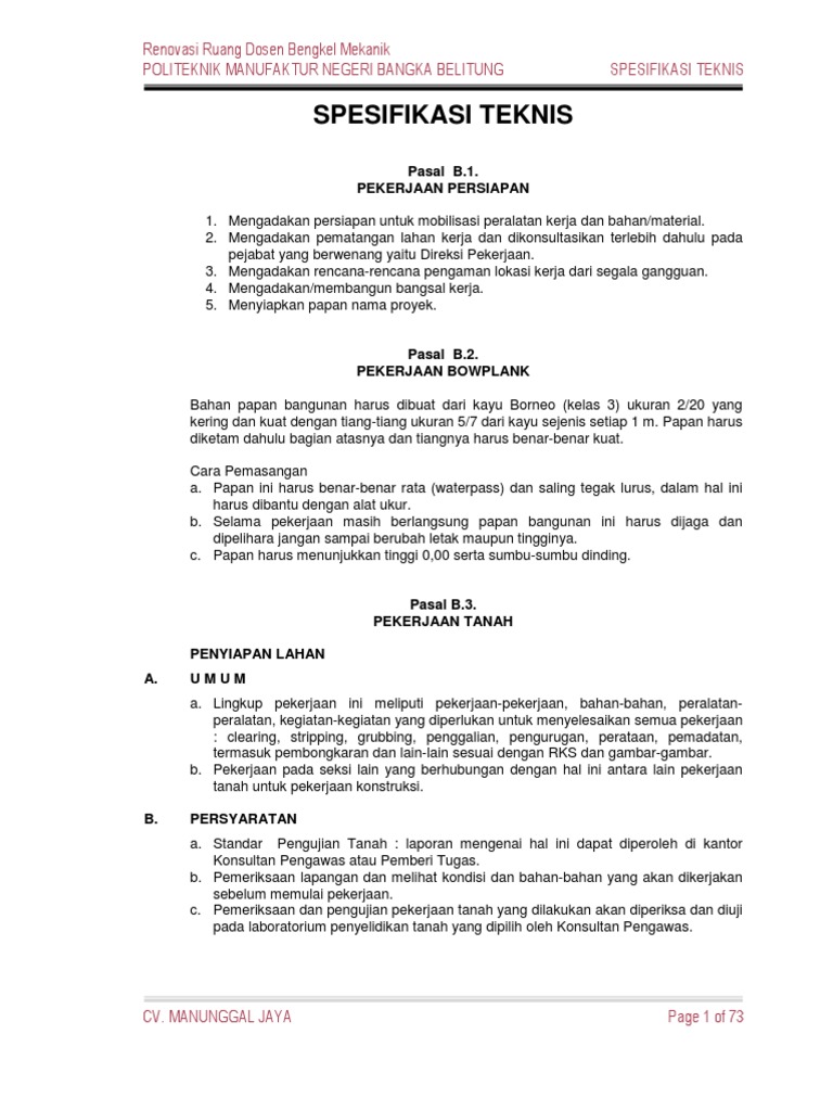 Contoh spesifikasi teknis pekerjaan konstruksi. Dalam pekerjaan konstruksi spesifikasi teknis merupakan suatu tatanan teknik yang dapat membantu semua pihak yang terkait dengan pekerjaan konstruksi untuk sependapat dalam pemahaman sesuatu hal teknis tertentu yang terjadi dalam suatu pekerjaan. Untuk jasa konstruksi termasuk dalam mutu adalah metode pelaksanaan pekerjaan. Dengan demikian spesifikasi teknis diharapkan dapat. Direktorat jenderal bina konstruksi. Bab i pendahuluan. Daftar personel memuat daftar personel yang ikut dalam pengawasan pelaksanaan pekerjaan konstruksi.