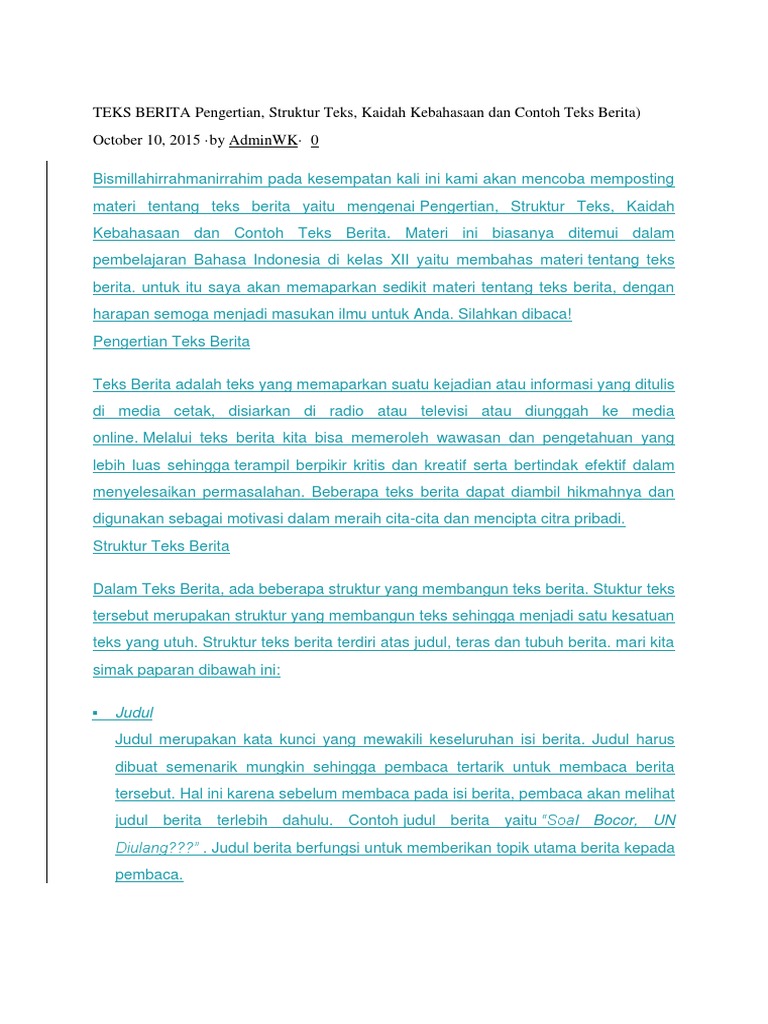 Pengertian struktur ciri ciri beserta kaidah kebahasaannya contoh teks berita berita sepertinya telah menjadi makanan sehari hari bagi kita semua. Sebuah teks berita memiliki struktur yang jelas. 5 contoh teks berita. 17 contoh teks berita singkat 5w 1h struktur kaidah pengertian. Teks berita ini disusun berdasarkan struktur teks peristiwa berita diikuti dengan latar belakang peristiwa dan diikuti sumber berita. Struktur teks adalah gambaran sebuah teks tersebut dibangun.