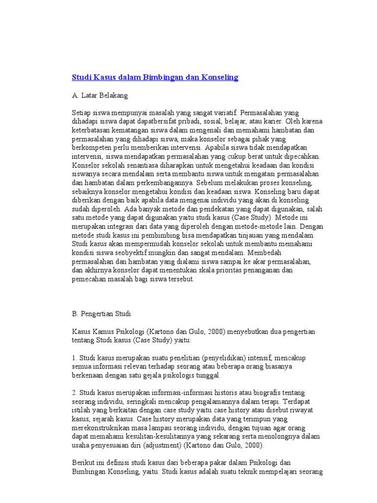 Contoh studi kasus bk. Sebelumnya terima kasih karena sudah memberikan gambaran tentang studi kasus. Untuk itu penulis melaksanakan studi kasus ini dengan maksud untuk mencari penyebab perilaku yang menyimpang dan hal itu untuk membantu konseli atau siswa untuk memecahkan permasalahan yang berkaitan dengan perkelahian. Baik yang dialami secara individual kelompok dalam keluarga lembaga tertentu atau bahkan bagian masyarakat secara lebih luas. Universitas sebelas maret. Academiaedu is a platform for academics to share research papers. Program studi bimbingan dan konseling.