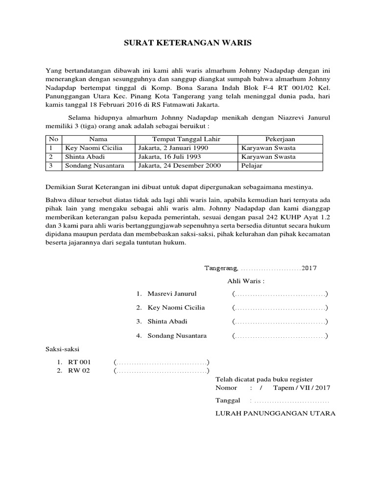 Berdasarkan fatwa waris tersebut notarisppat dapat menentukan siapa saja yang berhak untuk menjual tanah warisan dimaksud. Contoh surat fatwa waris admin sampaikan contoh surat fatwa waris untuk anda yang ingin membuat contoh surat fatwa waris karena kami menyampaikan format contoh surat fatwa waris lengkap dan kami berikan dibawah supaya anda bisa men contoh surat fatwa waris ini. Fatwa waris berlaku sebagai keterangan siapa saja yang berhak untuk mewarisi harta peninggalan si pewaris. Salam kenal mohon petunjuknya apa perbedaan surat keterangan waris dan akta hak mewaris pmna no. Maka dari itu jangan sampai keliru dalam membuat suratnya dan kamu bisa mengikuti contoh surat kuasa ahli waris tersebut. 31997 menyebut demikian yang dibuat oleh notaris dalam peralihan hak atas tanah karena waris bagi wni tionghoa.