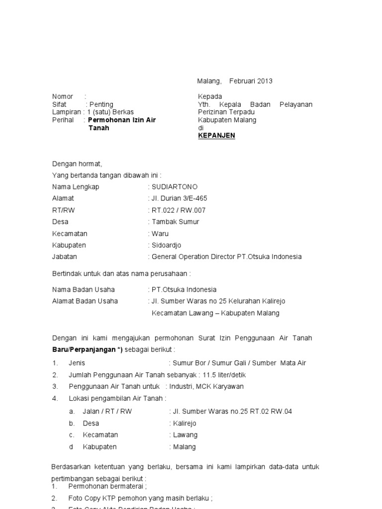 Contoh status permohonan. Contoh permohonan surat keterangan ketidak tersediaan air bersih air minum ke pdam surat kuasa. Surat izin pengeboran dan penggalian air tanah. Penilaian anda sangat berguna untuk meningkatkan kualitas konten kami. Surat izin pengambilan air tanah adalah izin untuk mengambil air tanah untuk keperluan industri perhotelan apartemen rumah sakit depot air minum pertambangan usaha di bidang perkebunan perikanan peternakan air minum penelitian ilmiah dan usaha jasa lainnya. Contoh keterangan hasil pengujian meter air dari upt metrologi legal.