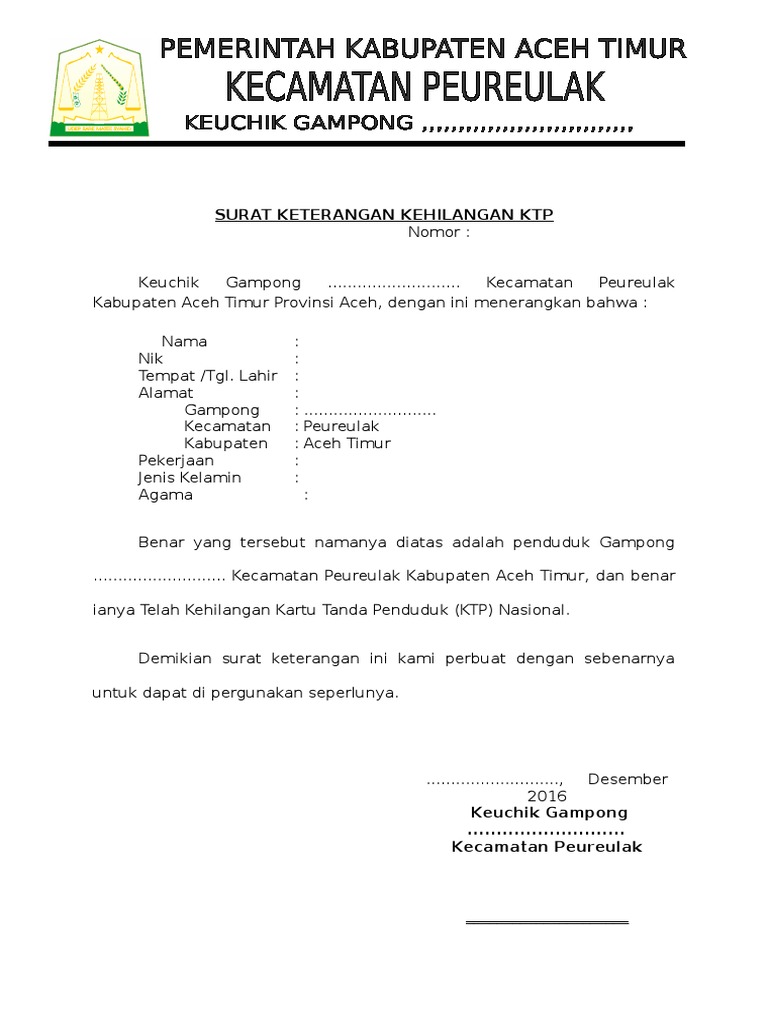 Contoh surat kehilangan ktp. Misalnya anda kehilangan dokumen penting seperti kartu tanda penduduk ktp padahal kartu tersebut peranannya sangat penting sehingga anda tidak bisa melakukan aktifitas secara normal. Berikut ini merupakan contoh surat keterangan pengganti. Jika kehilangan kartu atm wajib menunjukkan nomor rekening bank dan kantor cabang di mana anda membuka rekening. Dokumen penting tersebut diantaranya sim stnk bpkb ijazah sertifikat bahkan sampai kartu atm. Jika kehilangan sim wajib menunjukkan fotokopi sim yang hilang kalau tidak ada nomor sim. Kejadian kehilangan dokumen penting ini juga pernah kami alami sendiri.