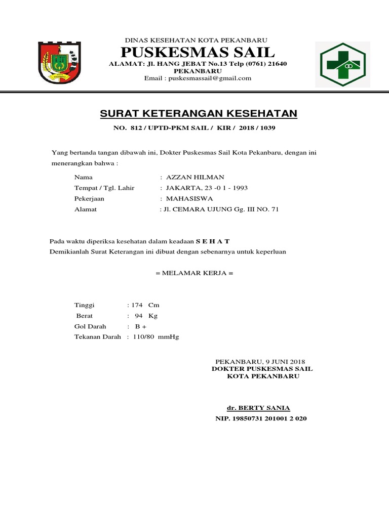 Contoh surat keterangan sehat untuk melamar kerja. Surat keterangan berbadan sehat yang bisa dibuat di puskesmas dokter praktek dan rumah sakit. Dari namanya kita sudah mengetahui bahwa surat ini nanti akan digunakan untuk hal hal yang berkenaan dengan melamar pekerjaanmelamar pekerjaan memang tidak bsia dilakukan secara sembarangan atau dengan cara kita sendiri. 15 contoh surat keterangan sehat untuk berbagai keperluan jika anda pernah melamar pekerjaan atau sudah menikah anda tentu pernah mengurus jenis surat ini. Kemudian perhatikan juga apakah perusahaan mengeluarkan syarat khusus untuk lamaran kerja misal harus ada surat sehat keterangan bebas narkoba dan lain sejenisnya. Misalnya surat keterangan sehat surat keterangan bebas dari kriminalitas maupun surat keterangan pengalaman kerja. Surat ini merupakan contoh dari surat resmi dimana penulisan dan penggunaan bahasa yang harus sesuai dengan ejaan yang disempurnakan.