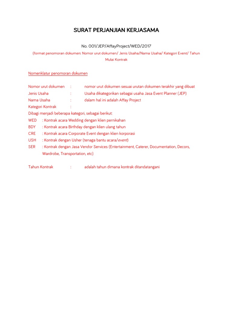 Surat perjanjian kontrak kerja semua perusahaan pada dasarnya sama karena di indonesia sendiri segala sesuatu yang berhubungan dengan tenaga kerja dan karyawan sudah diatur dalam undang undang agar dapat menjamin setiap orang dapat mendapatkan hak nya masing masing. Contoh surat perjanjian kerjasama event. Inilah pembahasan lengkap terkait contoh surat kontrak kerjasama catering dengan perusahaan. Admin dari blog contoh seputar surat 2019 juga mengumpulkan gambar gambar lainnya terkait contoh surat perjanjian wedding organizer dengan klien dibawah ini. Kumpulan contoh surat perjanjian kerjasama wedding organizer yang benar 2019. Contoh surat pernyataan kerja contoh surat dinas contoh surat lamaran kerja pengertian dan penggunaan perjanjian kerjasama secara sederhana.