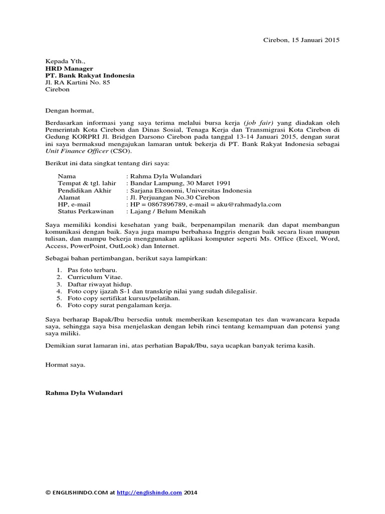 Berikut ini adalah contoh surat lamaran kerja yang ditunjukan untuk lowongan kerja di bank sebagai contoh surat lamaran kerja ini di tunjukan untuk bank cimb niaga finance di bandar lampung. Contoh surat lamaran kerja assalamualaikum guys kali ini kita akan membahas tentang contoh surat lamaran kerja bank mandiri. Di graha mandiri jl. Contoh surat lamaran kerja di bank mandiri yang terhormat hrd bank mandiri cabang kudus jalan jend sudirman 63 kudusdengan hormat saya yang bertanda tangan di bawah ini. S1 akuntansi telepon.