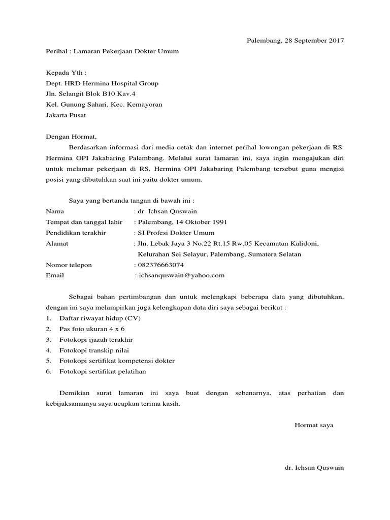Contoh Surat Lamaran Kerja Di Rumah Sakit