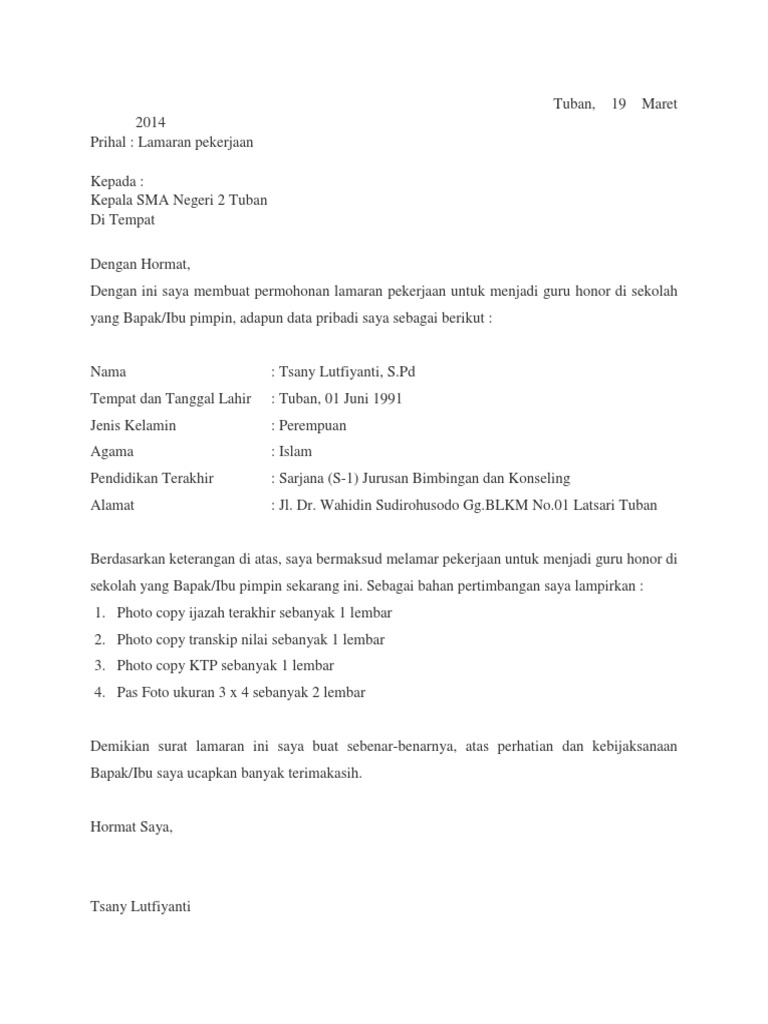 Contoh surat lamaran kerja pada artikel ini kita akan membahas contoh surat lamaran pekerjaan yang dapat kamu dapatkan beserta file doc nya. Itu tadi merupakan contoh surat lamaran kerja yang bisa anda gunakan untuk membuat surat lamaran kerja dengan cara tulis tangan maupun dengan ketik komputer.