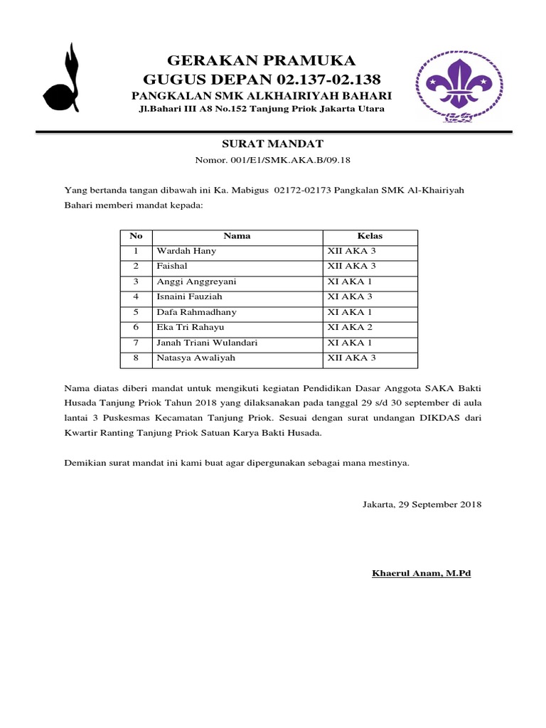 Mabigus smp negeri 3 demak. Sabtu 22 maret 2014. Contoh surat mandat pramuka. Surat mandat nomor. Syaf panglima melayu regular tanggal. Untuk mengikuti perkemahan bhakti pramuka di bumi perkemahan balam asri jambore yang akan dilaksanakan dari tanggal 15 sd 17 desember 2015.