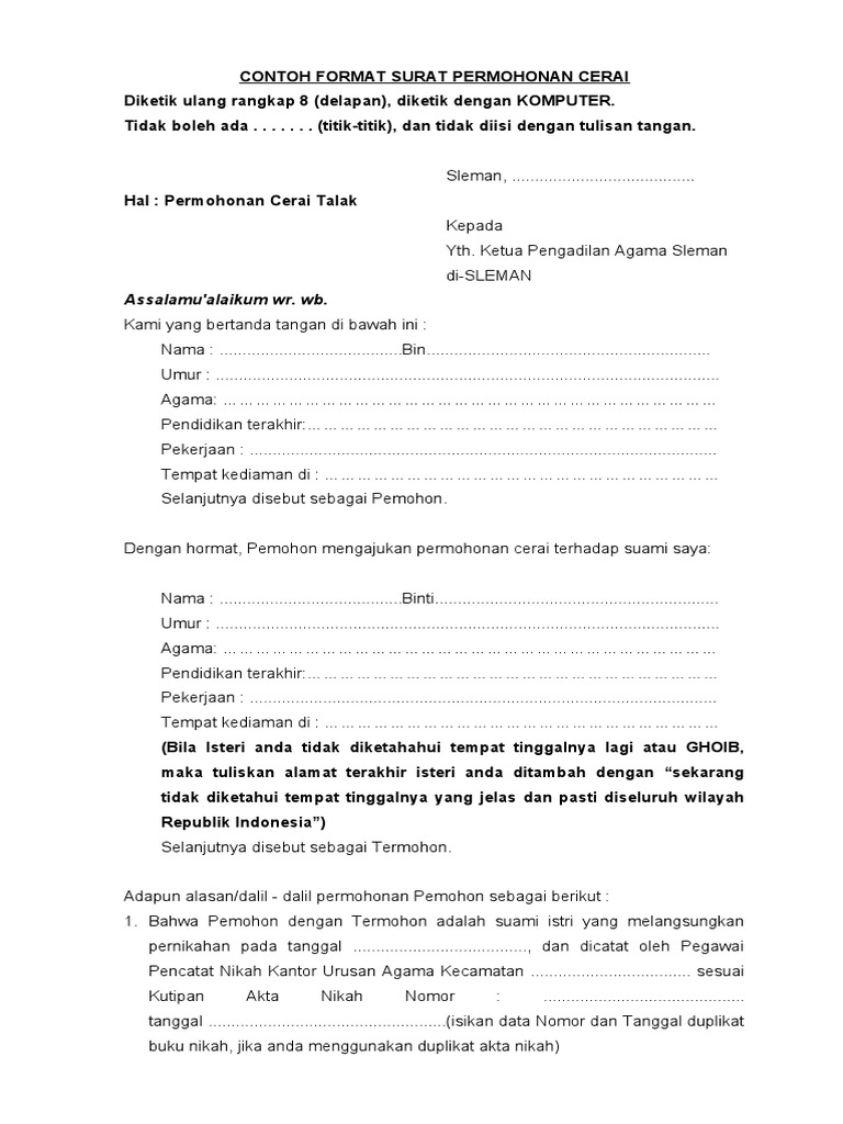 Contoh surat permohonan cerai. Contoh surat permohonan cerai talak oleh suami merupakan surat yang diajukan oleh suami kepada pengadilan agama setempat. Pada kesempatan kali ini kita akan memberikan contoh surat permohonan cerai atau juga biasa disebut gugatan cerai. Surat permohonan cerai ini ada 2 format untuk orang yang mampu membiayai semua perkaranya dan untuk orang yang tidak mampu yang membutuhkan bantuan biaya pemerintah disebut juga sebagai prodeo. Format gambar contoh surat gugatan cerai istri kepada suami non muslim terbaik 2019. Tujuannya tentu saja untuk proses perceraian. Contoh surat permohonan cerai.