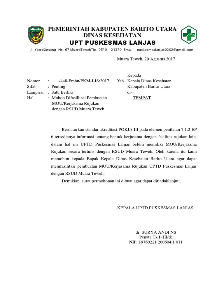 Contoh format surat mou memo of understanding berikut ini adalah sebuah surat perjanjian untuk mengikat dua buah pihak secara hukum sebelum terjadi sebuah kerjasama baik dalam perdagangan niaga usaha dan lain lain. Itulah beberapa contoh surat permohonan untuk berbagai kepentingan yang dapat kamu jadikan rujukan dalam membuat surat permohonan. Mou atau memorandum of understanding merupakan sebuah surat yang digunakan untuk melakukan kerjasama dari kedua belah pihak yang berbeda. Download contoh surat mou doc. Surat permohonan kerjasama format dan contoh surat kerjasama kegiatan produk surat permohonan kerjasama merupakan sebuah surat resmi yang dibuat untuk menawarkan sebuah permintaan atau permohonan kerjasama kepada seseorang atau perusahaan agar mereka mau menerima tawaran yang kita berikan. 15 contoh surat permohonan kerjasama di berbagai bidang sebagai suatu perusahaan yang ingin maju dan berkembang maka tentu harus menjalin kerjasama dengan perusahaan lain maupun berbagai pihak lain.