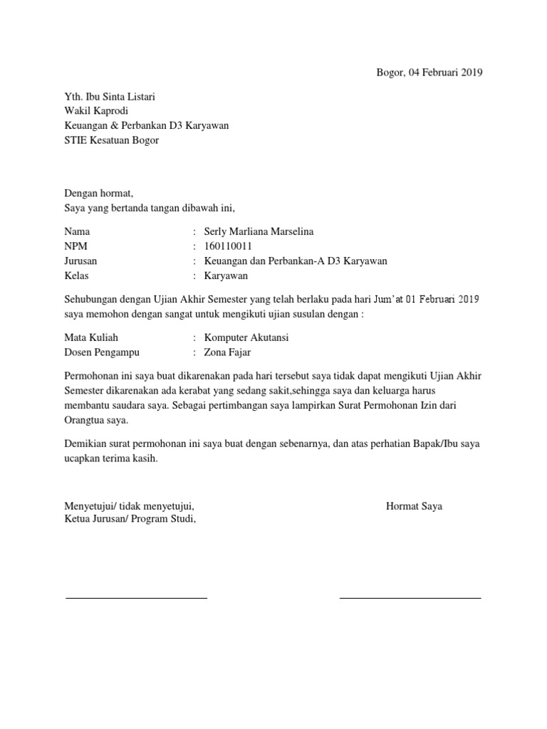 Pematangsiantar 15 mei 2013. Surat permohonan ujian susulan. Surat permohonan ujian susulan kepada. Contoh surat permohonan ujian susulan banyak sekali faktor yang membuat kita untuk tidak bisa menghadiri saat saat penting salah satu hal penting yang kadang kali sering terhambat adalah tidak dapat mengikuti utsuas di kampus terdapat beberapa alasan yang sering kali muncul dan khususnya untuk yang kuliah sambil kerja kadang ada saja hal hal yang bisa membuat kita tidak bisa ikut. Ketua stie sultan agung.
