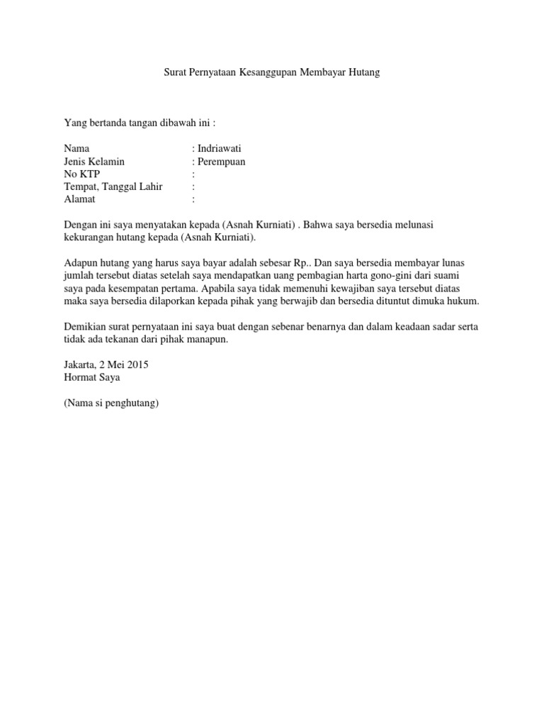 Namun beberapa orang mungkin saja memilih untuk menggunakan surat perjanjian hutang piutang. Contoh surat pernyataan kesanggupan membayar hutang tidak pernah bosannya kami menghadirkan informasi seputar kumpulan contoh surat. Namun mengonsep surat perjanjian memang sedikit sulit. Seperti yang kita ketahui bersama surat merupakan salah satu media untuk menyampaikan sebuah informasi baik itu informasi berupa undangan maupun sebuah pernyataan. Namun agar lebih terstruktur dan memiliki bukti fisik maka kedua belah pihak biasanya akan menggunakan surat perjanjian. Curat pernyataan hutang ke bank hutang perusahaan.
