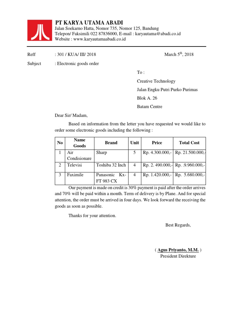 88 contoh surat balasan permintaan barang yang baik dalam bahasa inggrisartinya sekolahbahasainggris surat bisnis sangatlah penting ketika kita sudah terjun baik di sebuah perusahaan maupun di dunia usaha yang kita jalani. 3 contoh surat pesanan dalam bahasa inggris dan artinya surat pesanan diartikan sebagai surat yang dikirimkan oleh seseorang dari organisasi tertentu kepada penjual barang maupun jasa yang isinya adalah untuk memesan barang atau jasa tertentu. Jika dulu kebanyakan orang menggunakan surat sebagai media komunikasi maka berbeda dengan sekarang dimana orang lebih suka menggunakan telepon e mail ataupun whatsapp dan media sosial lainnya. Surat pemesanan order letter umumnya berisi informasi detail mengenai barang atau jasa yang akan dibeli. Namun untuk surat surat di indonesia kebanyakan masih menggunakan surat berbahasa indonesia. Am l 3a 16th october 2009 mr.