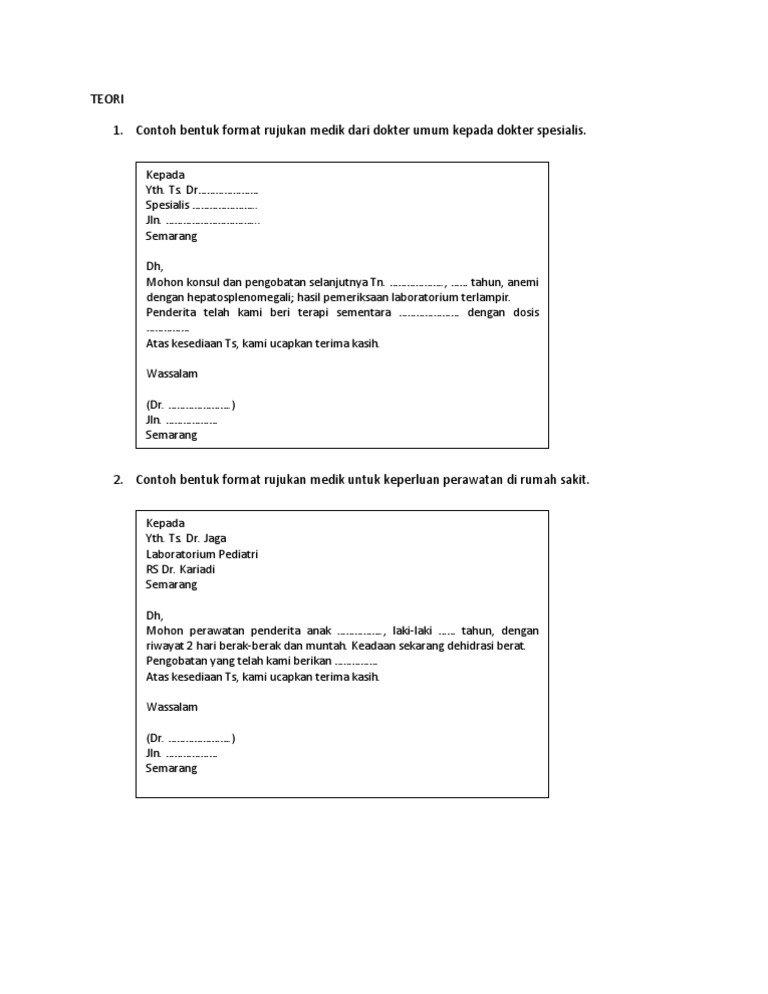 Semoga bermanfaat untuk anda yang sedang menulis format surat rujukan. Setelah surat rujukan diberikan oleh dokter gigi melalui pasien kepada dokter gigi yang lebih berkompeten biasanya akan ada surat rujukan balasan yang berikan oleh dokterdokter gigi terujuk kepada dokterdokter gigi perujuk melalui pasien yang menyatakan bahwa telah dilakukan pengobatanperawatan atau jawaban advice dari dokterdokter gigi perujuk. Atas perhatian bapakibu kami ucapkan terima kasih. Pemeriksaan yang dapat dilakukan ke dokter dapat berupa tes darah dari kedua orangtua untuk melihat kromosomnya atau bisa juga dengan melakukan pemeriksaan anticardiolipin aca. Demikian beberapa contoh surat rujukan dokter yang baik dan benar. Surat rujukan adalah surat pengantar medis yang berfungsi sebagai petunjuk pengobatan ataupun permohonan untuk dilakukan pengobatan lebih lanjut kepada tenaga medis yang lebih berkompeten di bidangnya.