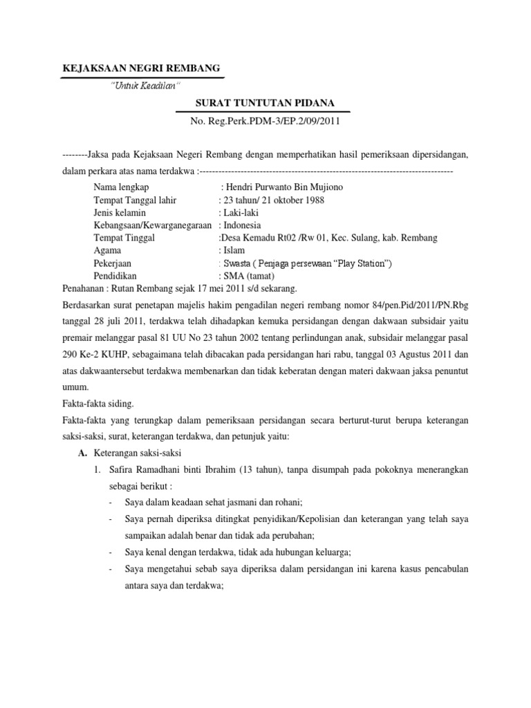 Kami jaksa penuntut umum pada kejaksaan negeri semarang dengan memperhatikan hasil pemeriksaan dalam sidang yang dilakukan oleh majelis hakim dengan penuh ketelitian kesabaran dan kecermatan terhadap terdakwa. Sebelum kami sampai kepada tuntutan pidana atas diri terdakwa perkenankanlah kami mengemukakan hal hal yang kami jadikan pertimbangan dalam mengajukan tuntutan pidana yaitu. Demikianlah tuntutan pidana ini kami bacakan dan serahkan dalam siding hari ini hari selasa tanggal 31 mei 1995. Bahwa ia terdakwa zulkarnain pada hari rabu tanggal 18 maret 2009 setidak tidaknya di dalam bulan desember 2009 pada pukul 0200 wib di daerah jeulingke atau setidak tidaknya masih dalam wilayah hukum pengadilan negeri banda aceh saat itu saksi i berada di rumah terdakwa sedang terlelap di kamar belakang kebetulan pembantu rumah. Surat tuntutan lengkap 1 contoh surat edukasi. Materi kuliah kemahiran hukum acara pidana by bos7wrd7waridi.