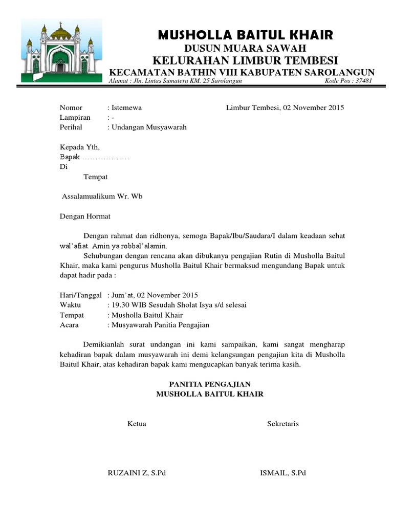 Download contoh surat undangan pengajian doc. Contoh surat permohonan dana untuk pembangunan masjid. Contoh surat undangan pengajian untuk anda yang saat ini mengadakan pengajian dirumah tetapi kurang tahu tentang membuat surat undangan yang baik maka anda bisa mengetahuinya disini di mana blog contoh surat dan proposal memberikan format surat undangan pengajian yang bisa anda terapkan. Sekian penjelasan untuk kesempatan kali ini kita sambung dikesempatan lain untuk membahas jenis surat yang lain. Contoh surat undangan apabila anda ingin mengadakan suatu kegiatan dan ingin mengundang banyak pihak anda pasti membutuhkan surat undangan. Untuk dapat mendownload contoh surat undangan pengajian dalam format doc silahkan klik link berikut ini.