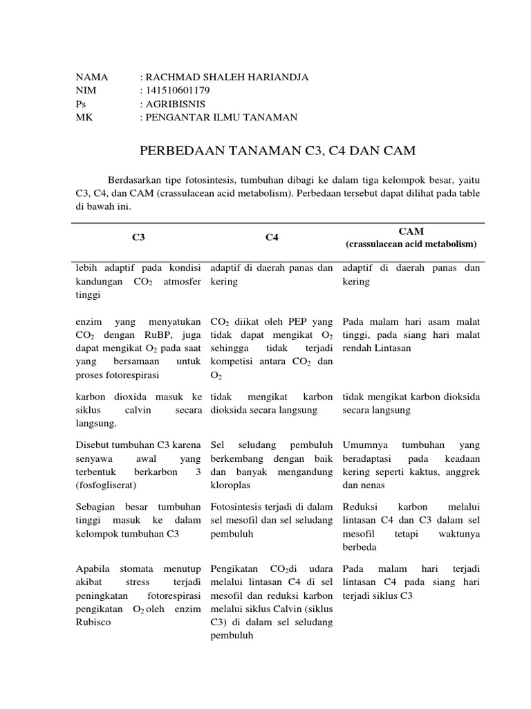 Pada siklus tersebut co 2 akan diikat oleh ribulosabifosfat rubp dan membentuk asam fosfogliserat pga yang merupakan senyawa 3 c. Sebagian besar tanaman pertanian seperti gandum kentang kedelai kacang kacangan dan kapas merupakan tanaman dari kelompok c3. Berikut adalah ciri ciri tanaman c3 c4 dan cam secara detail. Tumbuhan cam adalah tumbuhan yang stomatanya membuka pada malam hari dan menutup pada siang hari memiliki laju fotosintesis yang rendah bila dibandingkan dengan tanaman c3 dan c4 lakitan 1995.