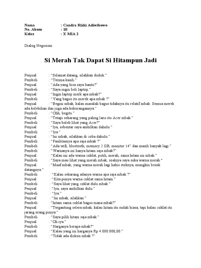 Tuliskan satu contoh bait puisi dengan rima kembar. Dialog negosiasi 3 orang 9295606 1. Contoh teks negosiasi lebih dari dua orang. Dalam kurikulum 2013 teks negosiasi dipelajari pada mata pelajaran bahasa indonesia kelas x sma di pelajaran v dengan tema seni bernegosiasi dalam kewirausahaan. Carilah teks buku fiksi kemudian analisislah unsur unsur yang ada dalam teks tersebut. Contoh teks negosiasi kehidupan sehari hari.