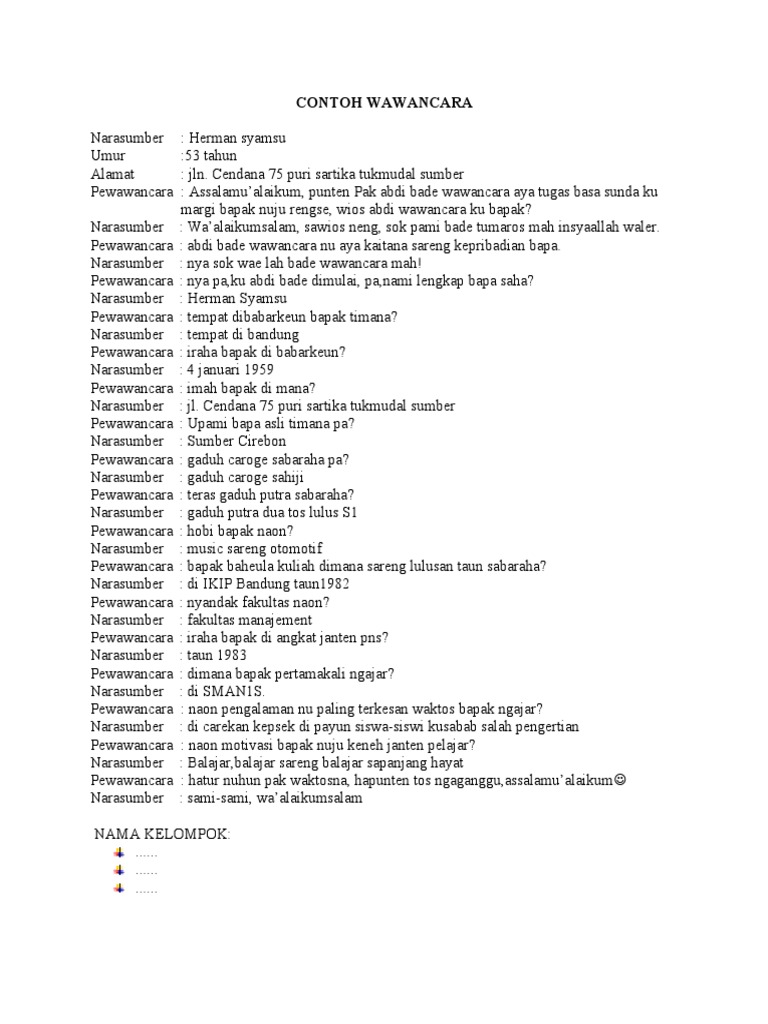 Pada umumnya memang biasanya wawancara ini dilakukan dalam kalimat langsung. Teh enong si pangusaha peuyeum. Contoh teks wawancara bahasa sunda 1 oka hasan bachtiar. Ku margi kitu materi wawancara anu aya dina ieu makalah sakadar conto wungkul. Pidato dalam bahasa sunda juga bertujuan untuk menyampaikan suatu gagasan kepada banyak orang atau di khalayan umum. Mengenai contoh teks wawancara simaklah pembahasannya di bawah ini.