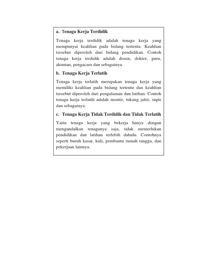 Tenaga kerja tidak terdidik adalah tenaga kerja yang tidak memiliki riwayat pendidikan yang tinggi dan tidak memiliki keterampilan atau kemampuan tertentu misalnya hanya sampai lulusan smp ataupun sd. Contoh tenaga kerja terdidik adalah dokter pengacara arsitek guru dan lain sebagainya. Pada dasarnya ketenagakerjaan dapat diklasifikasikan minimal menjadi tiga macam yakni tenaga kerja terdidik skill labour tenaga kerja terlatih trainer labour tenaga kerja tidak terlatih unskill labour. Contoh tenaga kerja tidak terdidik dan tidak terlatih. Contoh tenaga kerja tidak terdidik. Tenaga kerja tidak terdidik dan tidak terlatih merupakan tenaga kerja terampil dan pekerja terampil dilatih untuk mengandalkan kekuatan sendiri.