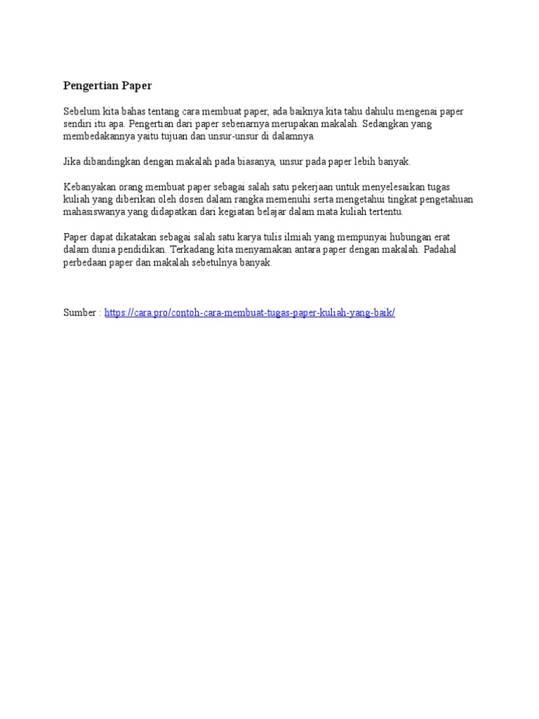 Contoh tugas paper kuliah. Membuat paper sendiri umumnya untuk memenuhi tugas dari dosen untuk mengetahui tingkat pengetahuan mahasiswa. Artikel tentang contoh paper kuliah akan menjawab pertanyaan anda. Contoh paper yang baik dan benartugas membuat paper bukanlah suatu hal yang asing bagi anda yang sedang sekolah atau kuliah karena paper merupakan suatu bentuk tugas yang diberikan dalam bentuk tulisan menyerupai karya tulis ilmiah secara lengkap dan rinci. Menurut standar paper biasanya ditulis sampai 6 halaman saja. Walaupun hanya terdiri dari beberapa halaman saja paper memiliki bahasan yang cukup lengkap. Contoh paper bagi anda yang sedang berada di bangku sekolah atau kuliah tentu sudah tidak asing lagi dengan tugas pembuatan paper.