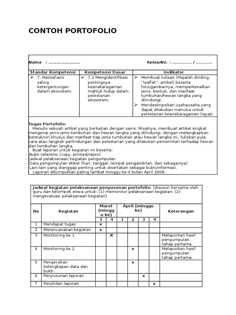 Berkas berkas portofolio yang dikumpulkan siswa adalah hasil pekerjaan siswa sendiri yang telah dilaksanakan selama belajar di kelas vi. Contoh kartu soal kisi soal hal 2. Didalam portofolio ini kami selaku penyusun hanya sebatas ilmu yang bisa kami sajikan memenuhi tugas dari dosen pembimbing dengan topik istilah esensial biologi dari bahasa asing. Kami menyadari bahwa keterbatasan pengetahuan dan pemahaman kami tentang biologi menjadikan keterbatasan kami pula untuk memberikan istilah yang lebih detail tentang biologioleh karena itu kritik dan saran. Berikut adalah contoh tugas dari guru kepada siswa untuk membuat portofolio 1. Penilaian portofolio adalah teknik penilaian yang dilakukan dengan cara menilai hasil karya peserta didik yang berupa kumpulan.