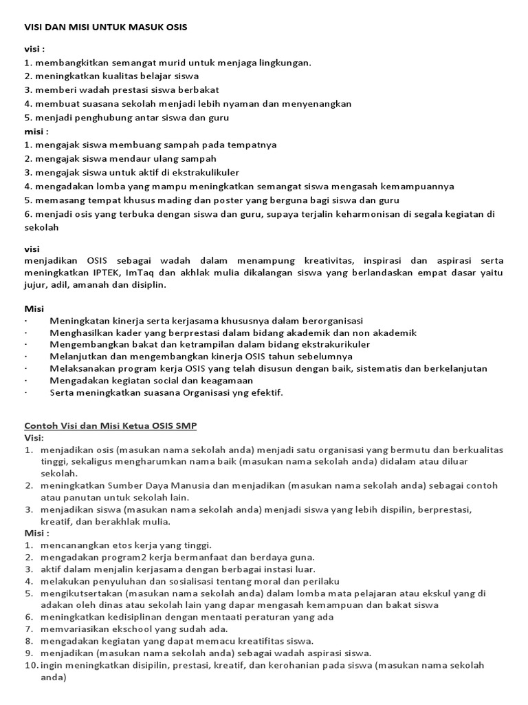 Hal ini diwujudkan dalam bentuk visi misi. Pada umumnya visi dan misi diwujudkan dalam bentuk tulisan. Untuk memperjelas maka dibuatlah dalam wujud tulisan visi dan misi. Patokan inilah yang digunakan sebagai landasan untuk melakukan berbagai aktivitas di dalamnya. Yuk simak contoh visi misi berikut ini. Ini adalah contoh visi misi ketua osis tentunya dapat kalian aplikasikan di sekolah.