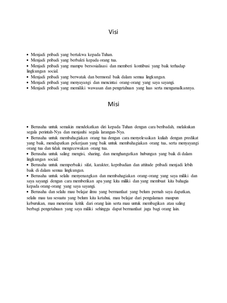 Bagi anda yang menganggap bahwa hidup itu perlu mempunyai visi dan misi maka dibawah ini saya berikan contoh yang mungkin dapat digunakan. Contoh visi dan misi pribadi. Saya bertawakkal kepada allah beribadah dengan ikhlas kepadanya menaati segala perintahnya mengikuti sunnah sunnah rasul dan selalu patuh kepada kedua orang tua. Untuk memperjelas maka dibuatlah dalam wujud tulisan visi dan misi. Visi dituliskan hanya dengan satu kalimat yang jelas sarat informasi dan fokus pada tujuan. Visi menjadi pribadi yang bertakwa kepada allah berakhlak mulia mendapatkan kesuksesan di dunia dan di akhirat selalu membahagiakan orang tua percaya diri dapat dipercaya dan bermanfaat bagi orang lain.